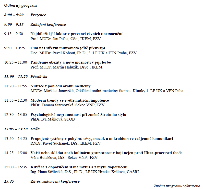Pro letošní konferenci jsme vybrali témata, která rezonují jak mezi laickou, tak odbornou veřejností. Jedním z nich jsou kardiovaskulární onemocnění, která jsou stále nejčastější příčinou úmrtí u nás. Zaměříme se na nové možnosti léčby, „nové“ rizikové faktory nebo aktuální zastoupení jednotlivých onemocnění. Druhým tématem je čím dál více aktuální obezita se svou významnou progresí ve výskytu, ale také v možnostech léčby. Střevní mikrobiota je třetím stěžejním tématem. Tato klíčová témata budou následně řešena z pohledu jednotlivých složek režimu, a to v duchu názvu celé konference, tedy řešení otázky, zda mají vůbec režimová opatření v éře moderní léčby ještě význam. Zaměříme se na faktory, které náš režim často ovlivňují, na aktuální situaci a souvislosti, které je třeba brát v potaz. Řešit budeme pohyb, stravování, psychickou stránku věci. Nabídneme praktické pohledy, úvahy a doporučení. V rámci odborného programu přiblížíme, jak může výživa souviset s orální medicínou.
